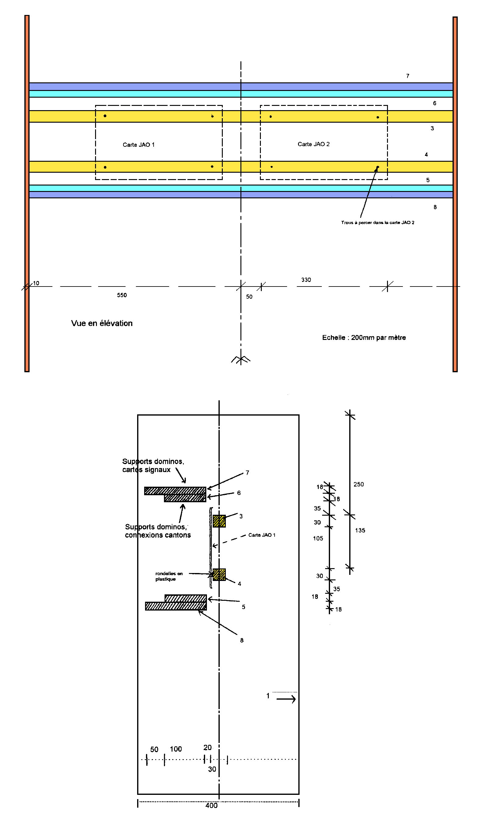 · Les pièces en contreplaqué ci dessus peuvent être achetées dans tout magasin de bricolage et prédécoupées aux bonnes dimensions en magasin. · La hauteur des montants 1 et 2 dépend de celle des tables du réseau si le râtelier est placé dessous. Il est possible également de suspendre ces montants à la table du réseau (ce que j’ai fait personnellement).· L’espace laissé au-dessus de la tablette 7 est nécessaire pour ranger les cartes signaux branchées sur les cartes ALIM supérieures et également pour accéder aux fils de liaison des cantons et aiguilles.· Pour la connexion des cartes ALIM et aiguilles, je n’ai rien trouver de mieux que des dominos classiques à pas de 8 mm découpés par série de 4 connecteurs (la longueur de ces groupes de 4 correspond au pas de fixation des cartes ALIM et aiguilles sur les cartes JAO1 et 2).· Pour passer les fils des cantons et aiguillages se raccordant sur les dominos vissés sur la tranche des tablettes 5 et 6, il convient de percer les tablettes 7 et 8 au droit des connecteurs des dominos avant montage de ces tablettes.· Le montage proposé permet de monter en fait une carte JAO1 et 3 cartes JA02 en ajoutant deux cartes à l’arrière des liteaux 3 et 4 et en doublant de façon symétrique (par rapport à l’axe de la coupe fournie). On peut également doubler la capacité par en dessous en rajoutant deux liteaux 3 et 4 et 4 tablettes 5, 6, 7 et 8. Dans ce cas, positionner la tablette supérieure 7 environ 15 cm en dessous de la tablette 8 du groupe supérieur précédent. |